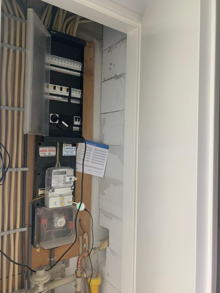 Dit hebben wij uiteraard netjes opgelost door nieuw elketra en leidingwerk aan te leggen in de badkamer, tevens hebben wij de oude meterkast vervangen voor een nieuwe meterkast. Bij de nieuwe meterkast zijn de elktra kabels netjes en veilig weggewerkt volgens de norm. De oude knoppen zijn vervangen door een moderne meterkast.