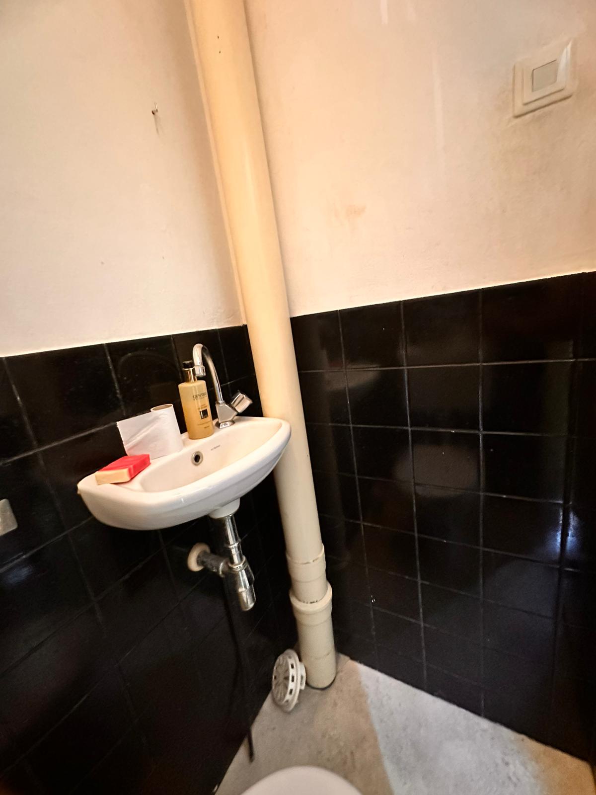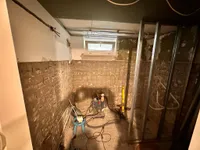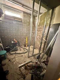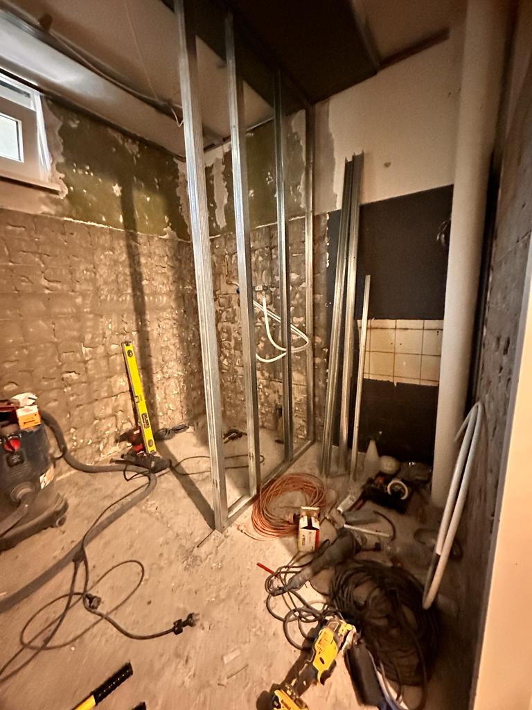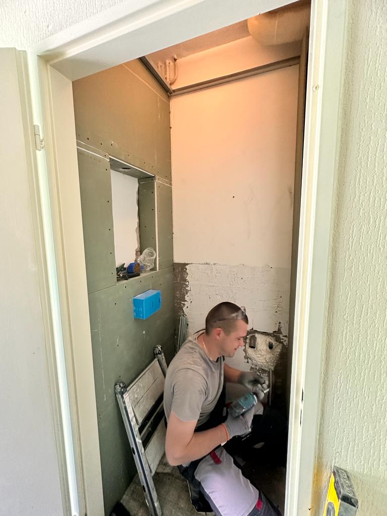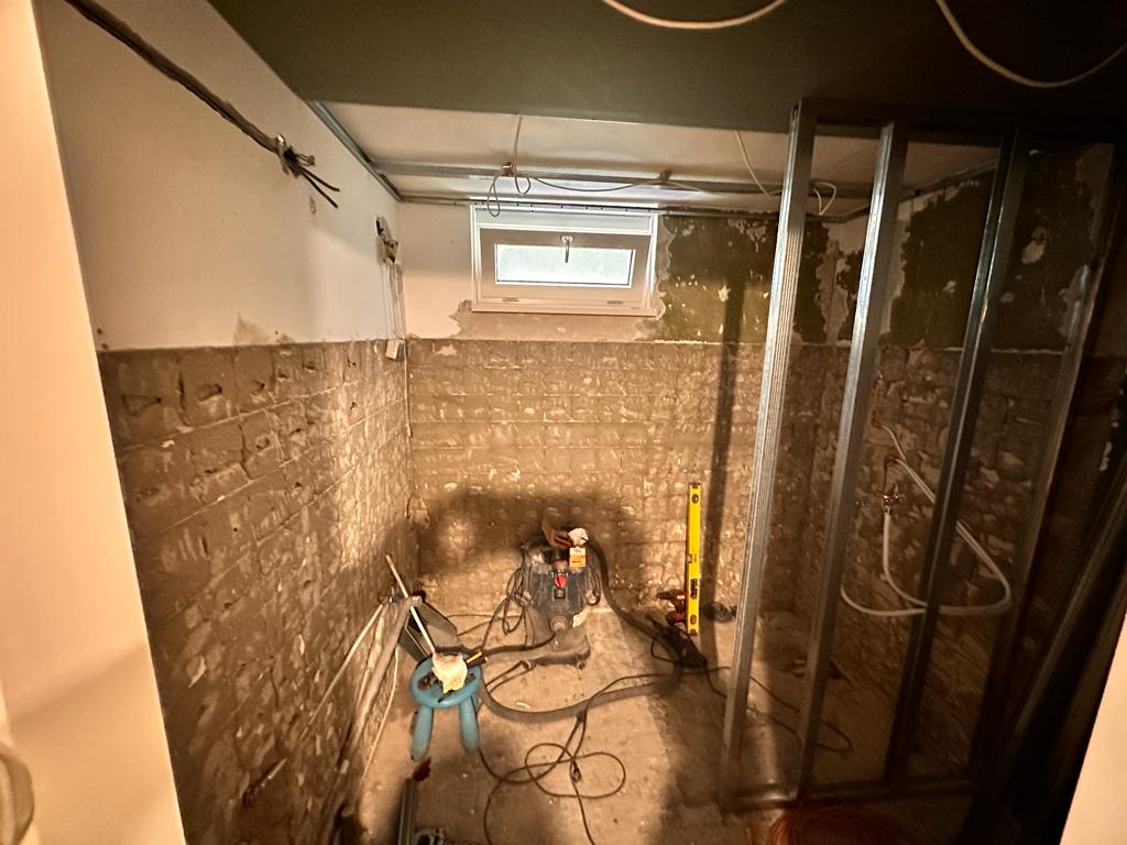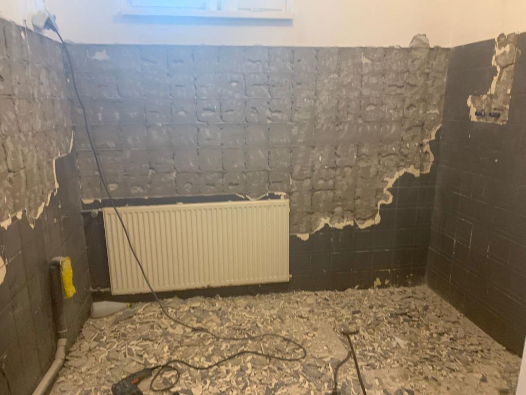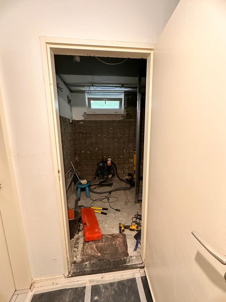 Tijdens de sloopwerkzaamheden in de badkamer is er een waterleiding, die in de vloer zat, en elektraleiding, die er vlak naast, zat geraakt. Als gevolg een lekkage die door liep naar de meterkast.