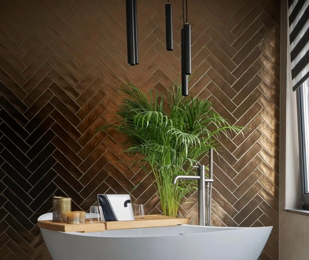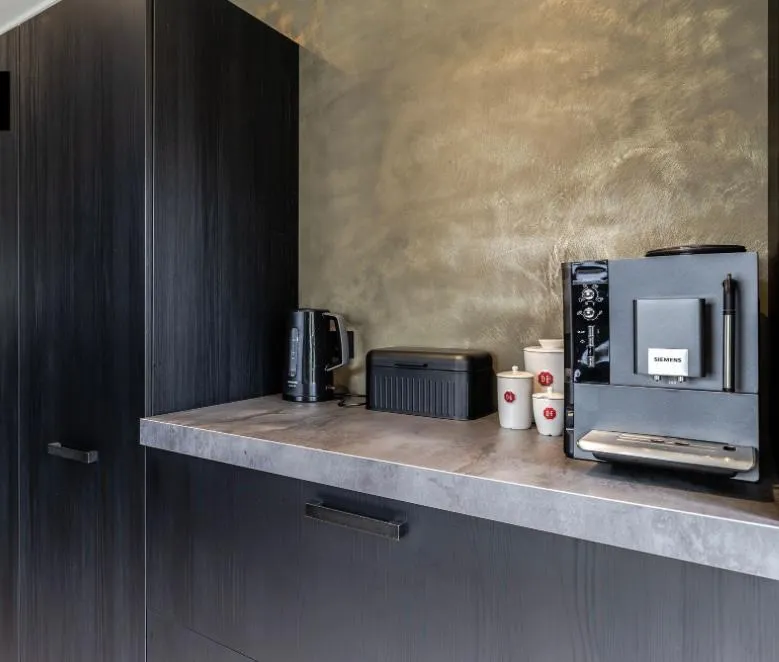 De achterwand heeft een bronseffect met de speciale stucpasta, omdat het in de keuken is toegepast, is dit afgewerkt met een waterafstotende coating.