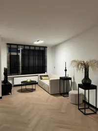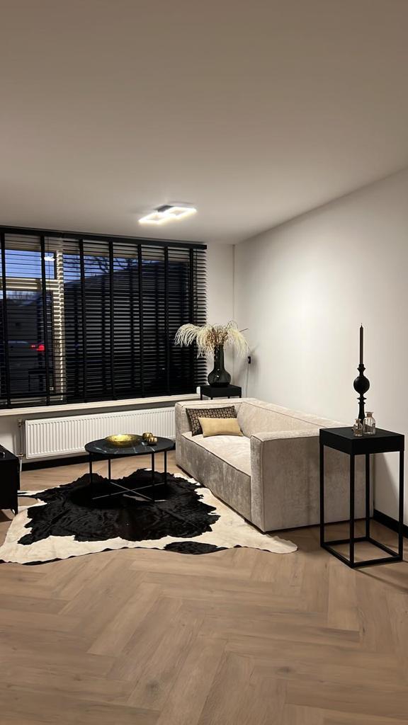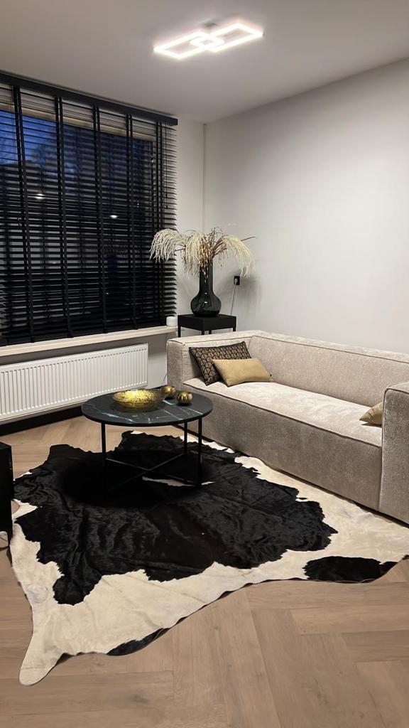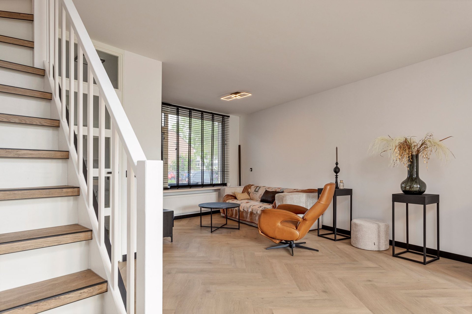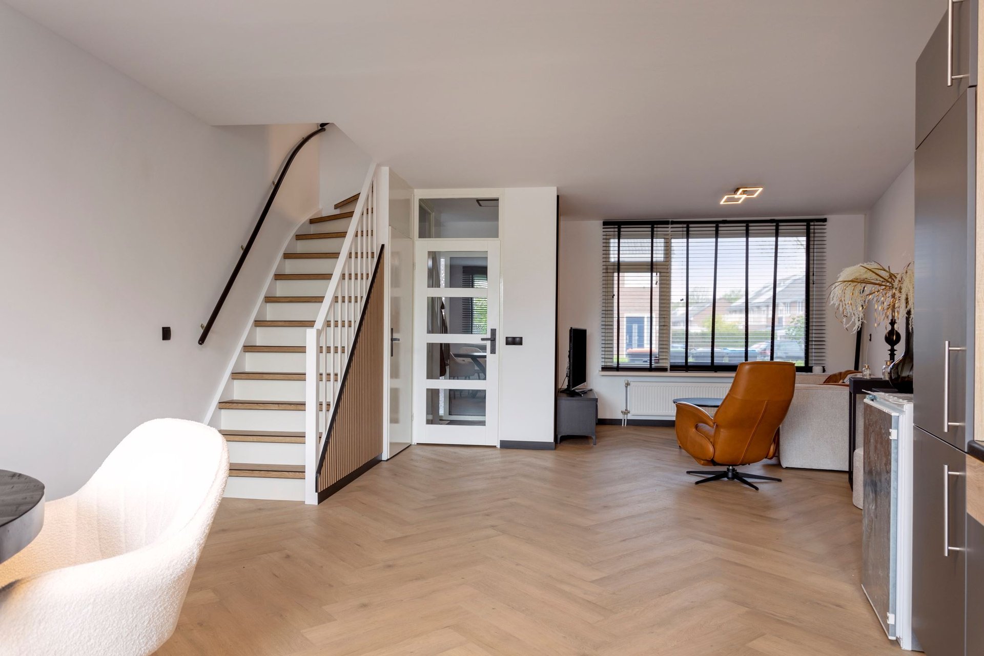Bij het betreden van de woonkamer, wordt je direct getroffen door de lichte ruimte. De muren zijn afgewerkt met glad stucwerk en dat zorgt voor een moderne, maar neutrale basis. De visgraat vloer zorgt voor een luxe speelse uitstraling.