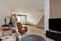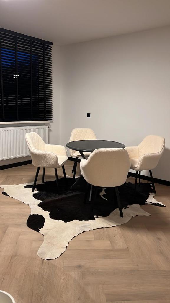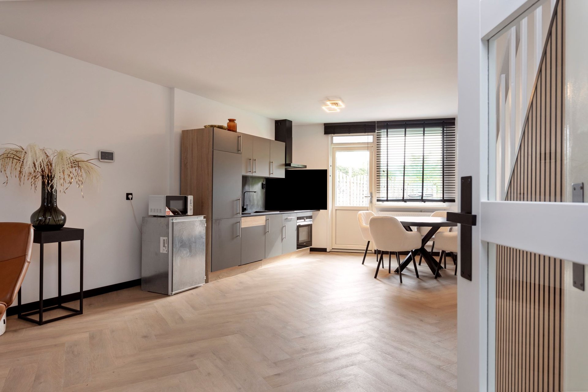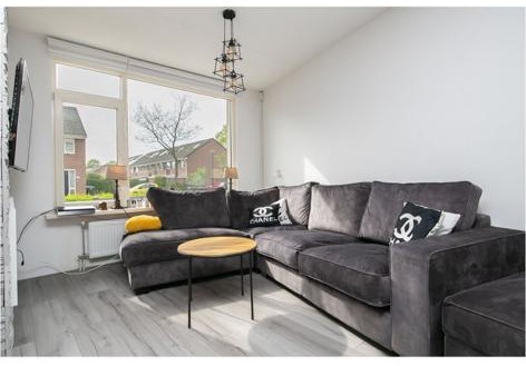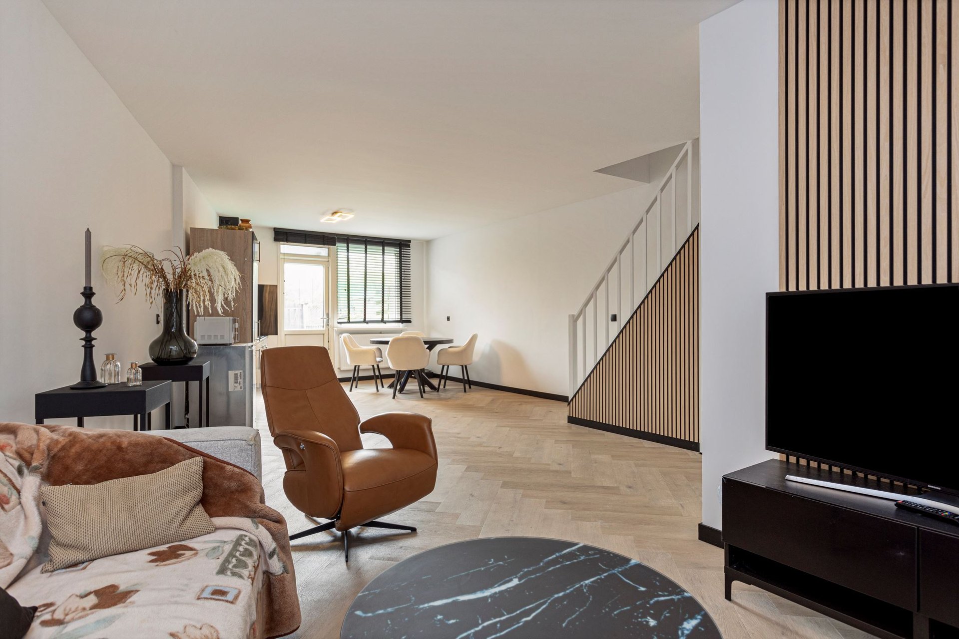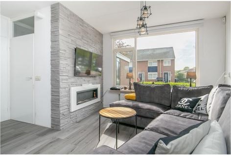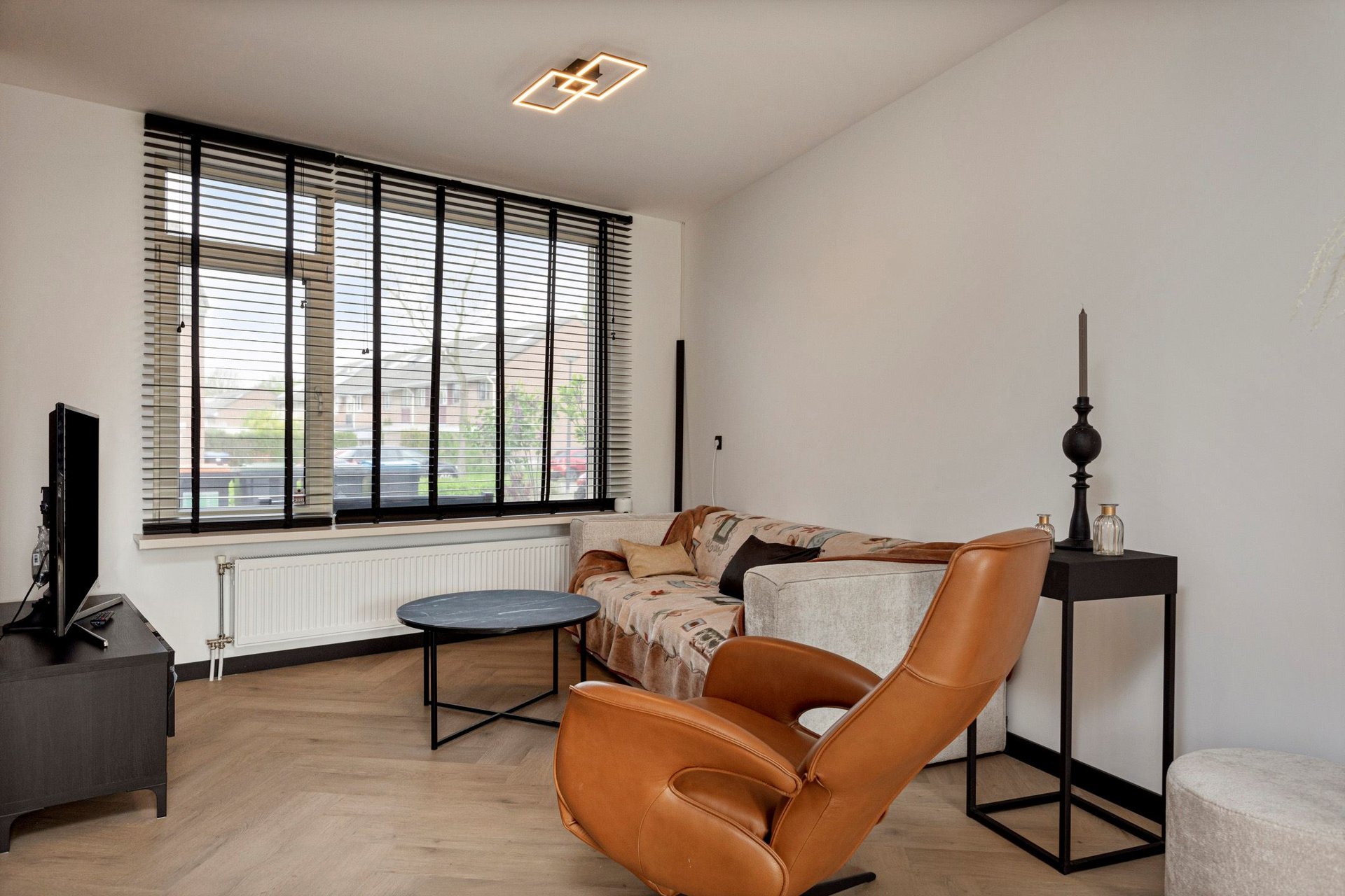 Bij het betreden van de woonkamer, wordt je direct getroffen door de lichte ruimte. De muren zijn afgewerkt met glad stucwerk en dat zorgt voor een moderne, maar neutrale basis. De visgraat vloer zorgt voor een luxe speelse uitstraling.