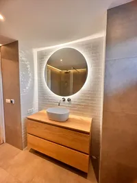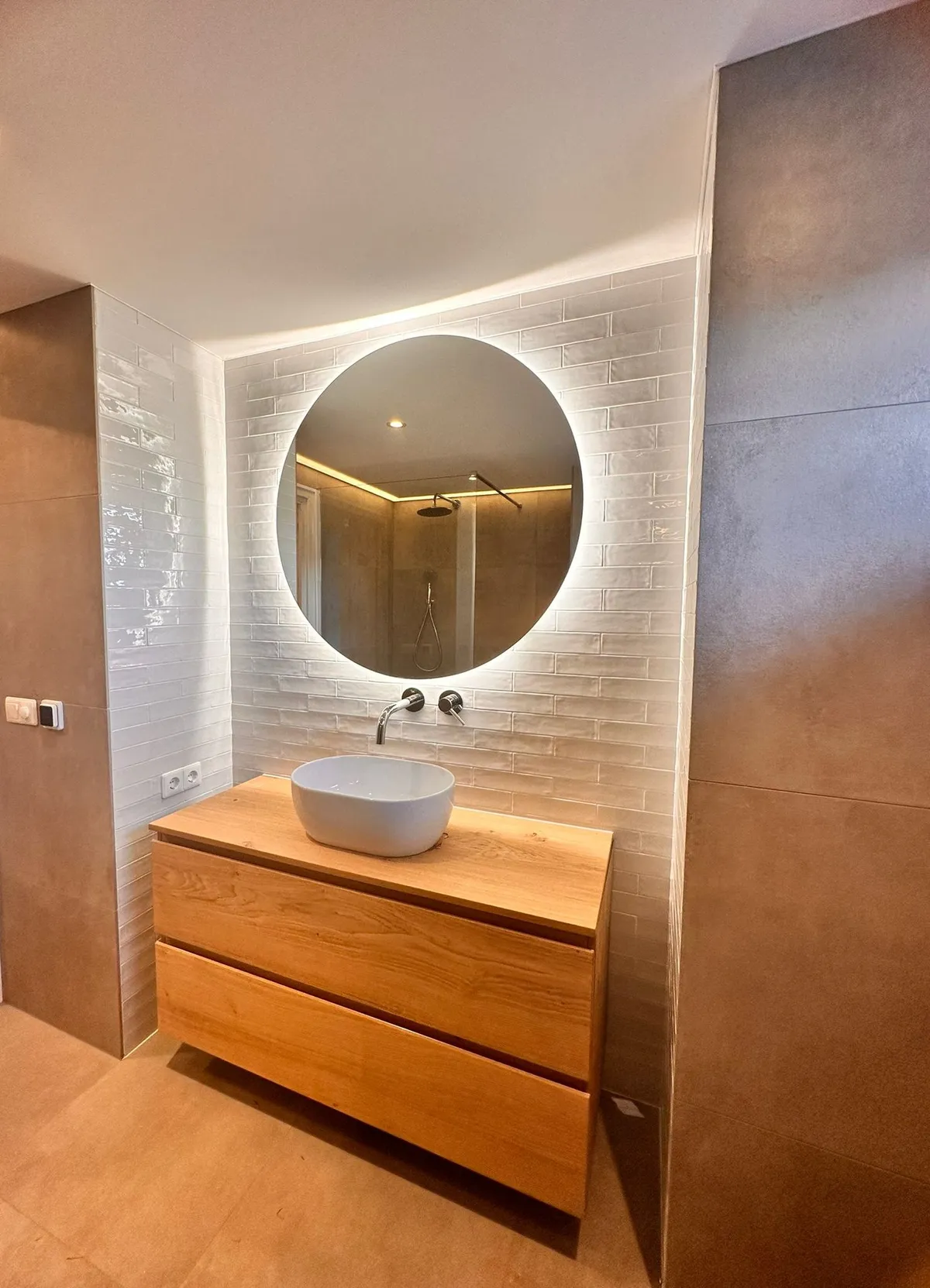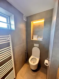 De verouderde badkamer is omgetoverd naar een moderne sfeer. Het binnenstucwerk is met uiterste precisie uitgevoerd en veroorzaakt een licht maar warm gevoel in de badkamer.
