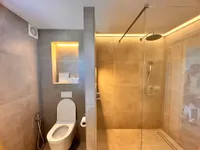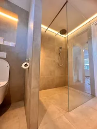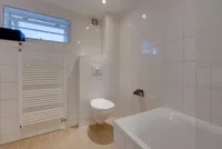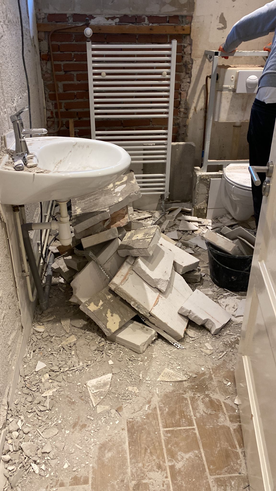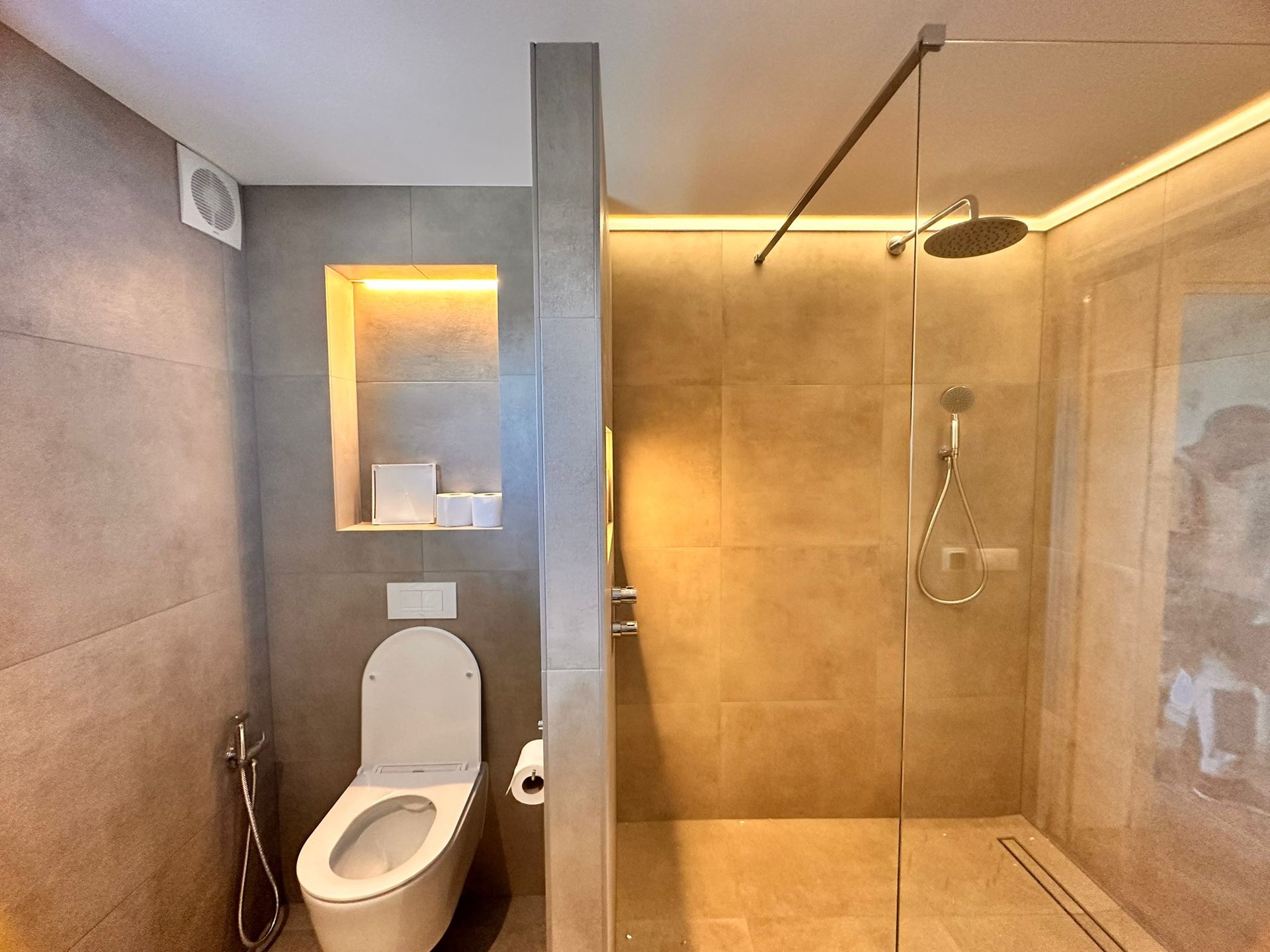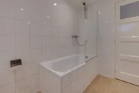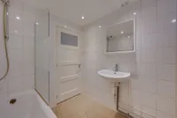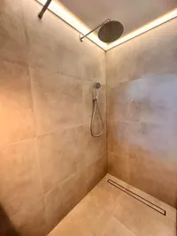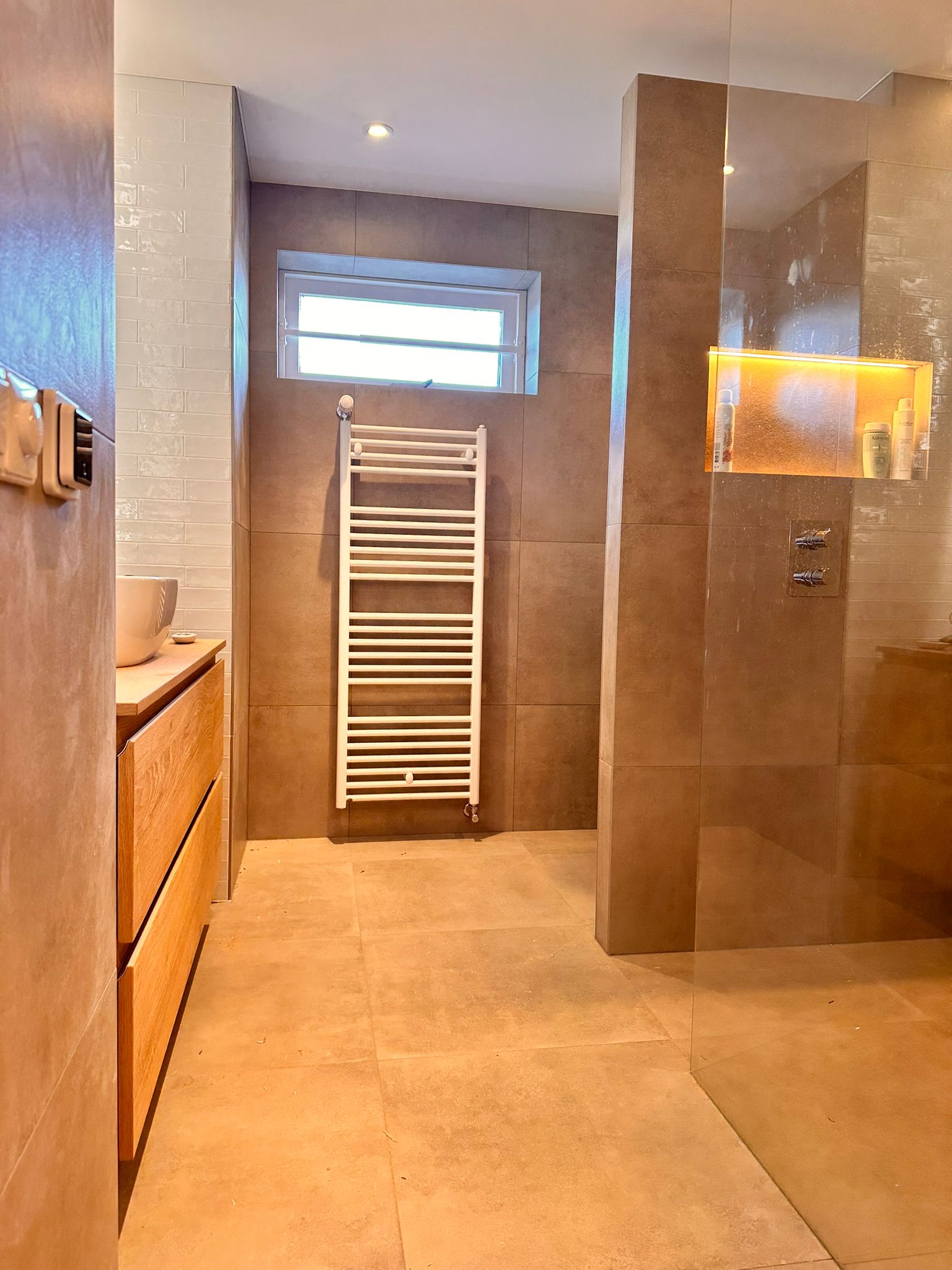 Het bad hebben we eruit gehaald en ingeruild voor een moderne inloop douche. Er is een nis voor het badkamermeubel tot stand gebracht.