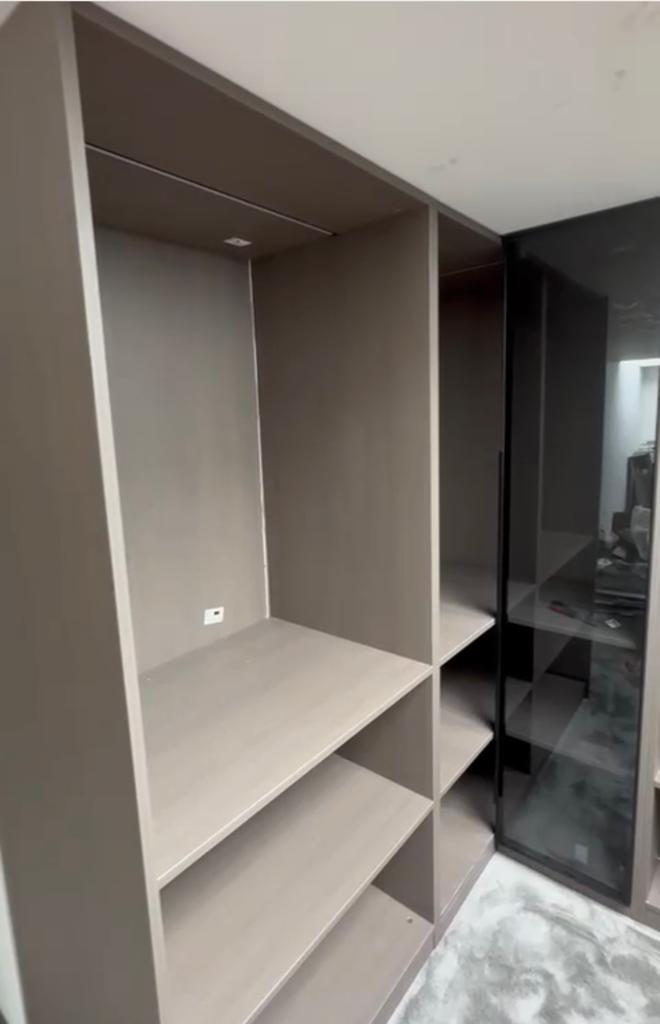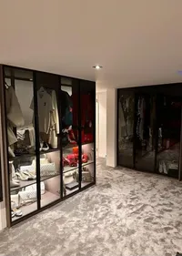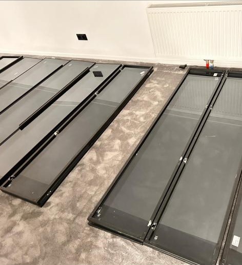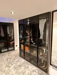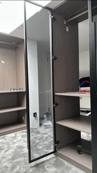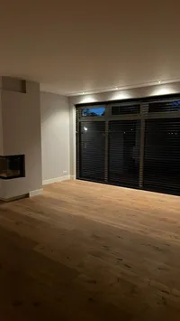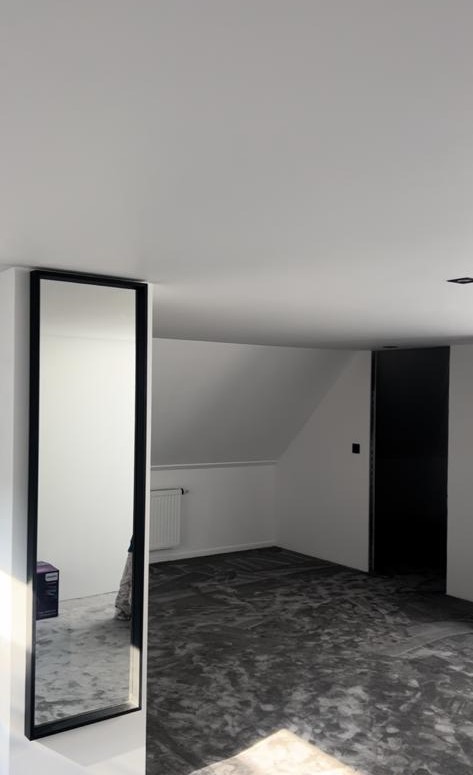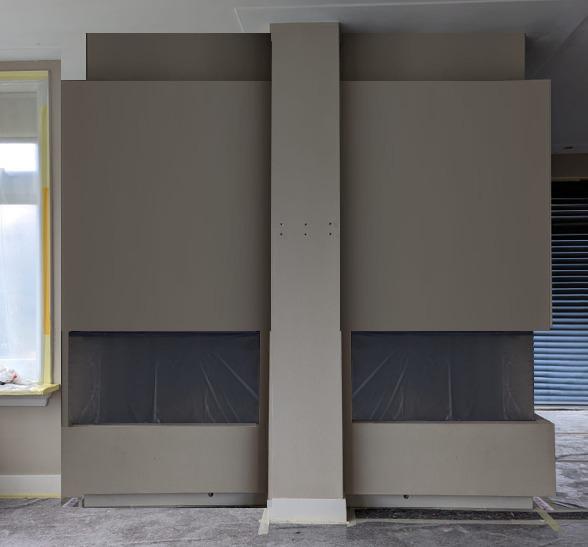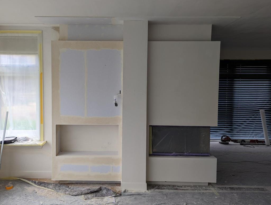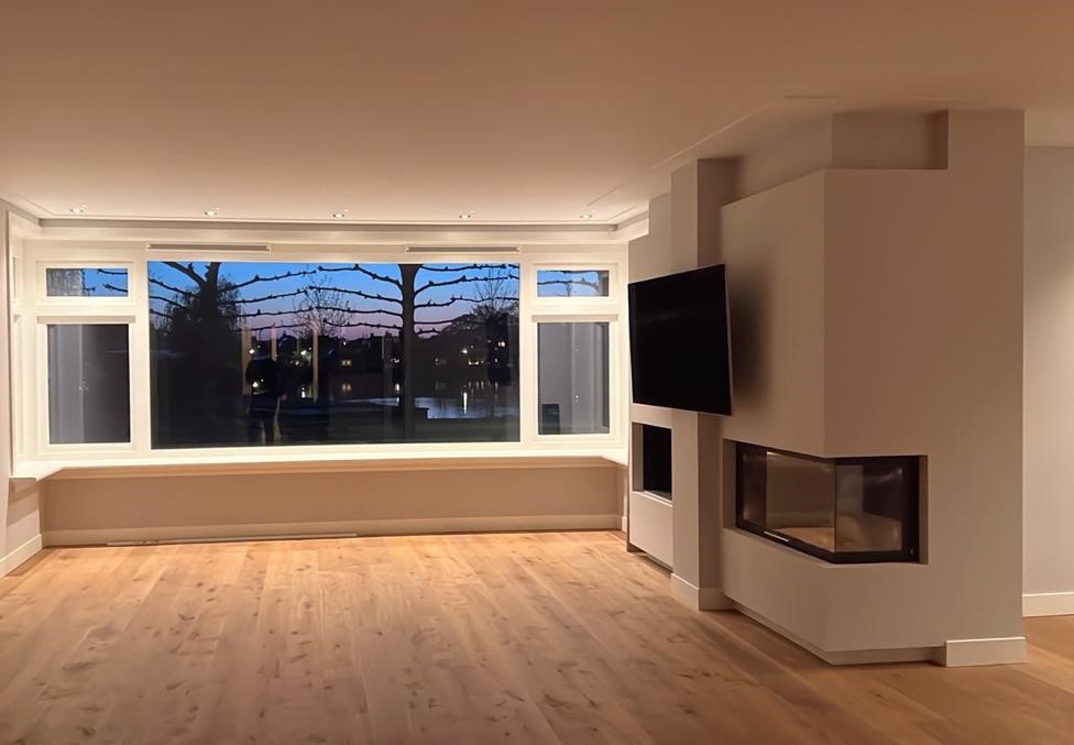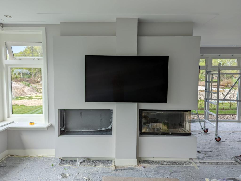 De klant wenst een niet-bestaande wand te plaatsen in de woonkamer, met een spiegeleffect voor een nis en de openhaard. Dit zorgt voor een 3D-effect rondom de televisie.