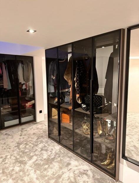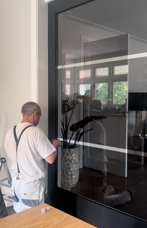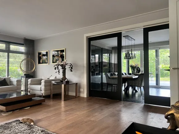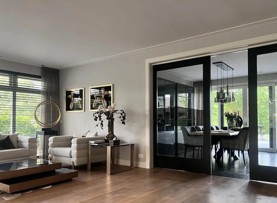 Beneden wilde de klant graag de schuifdeuren zwart om de leefruimte en het eetvertrek van elkaar scheiden, accentueren om zo beide ruimtes te benadrukken. Op de foto is het effect te zien.