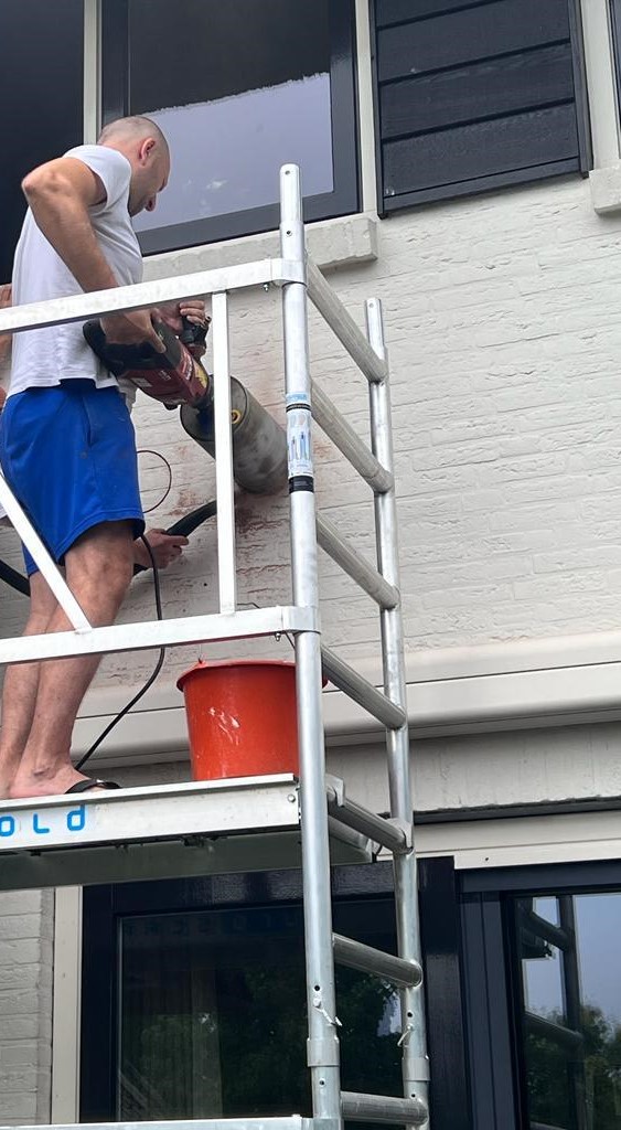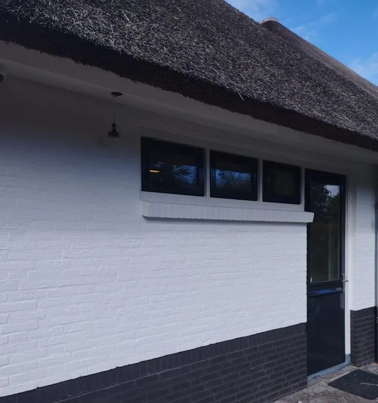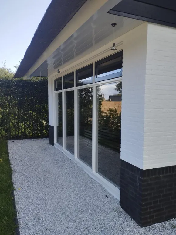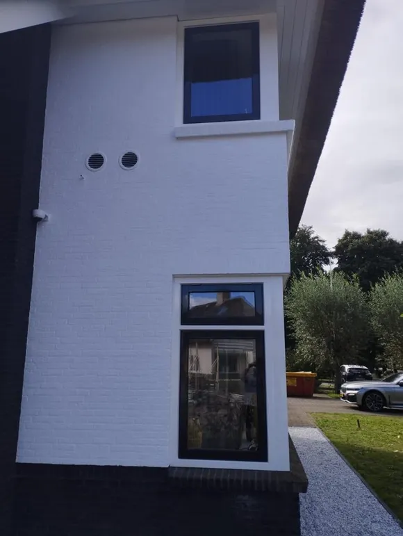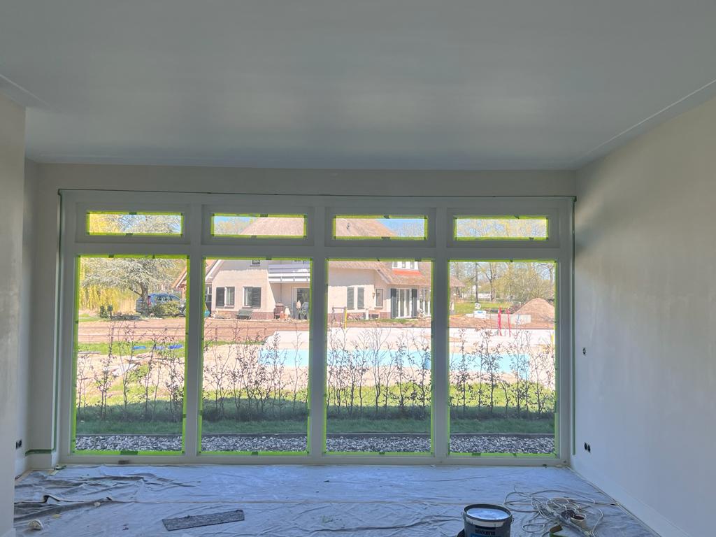Zowel de gevels als de kozijnen van de hele villa zijn opnieuw geschilderd. De klant heeft gekozen voor materialen van ons, waaronder de Caparol Amphibolin verf voor het buiten schilderwerk. Deze verf is van dezelfde kwaliteit als Sigma, en sommigen beweren zelfs dat het nog beter is. Het is een speciale verf die in één keer dekt en gemakkelijk vuil van de muur kan worden verwijderd met een vochtige doek. Voor de kozijnen is er gebruik gemaakt van Sikkens Rubbol SB High Gloss lak.