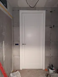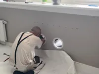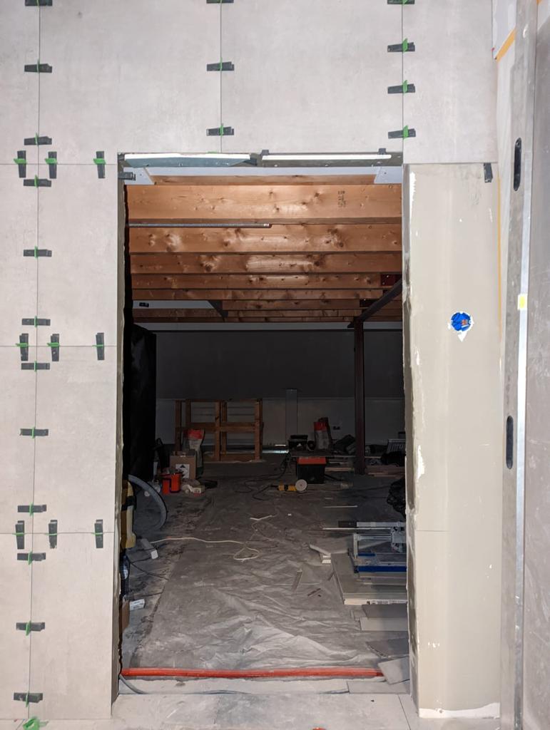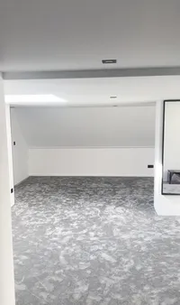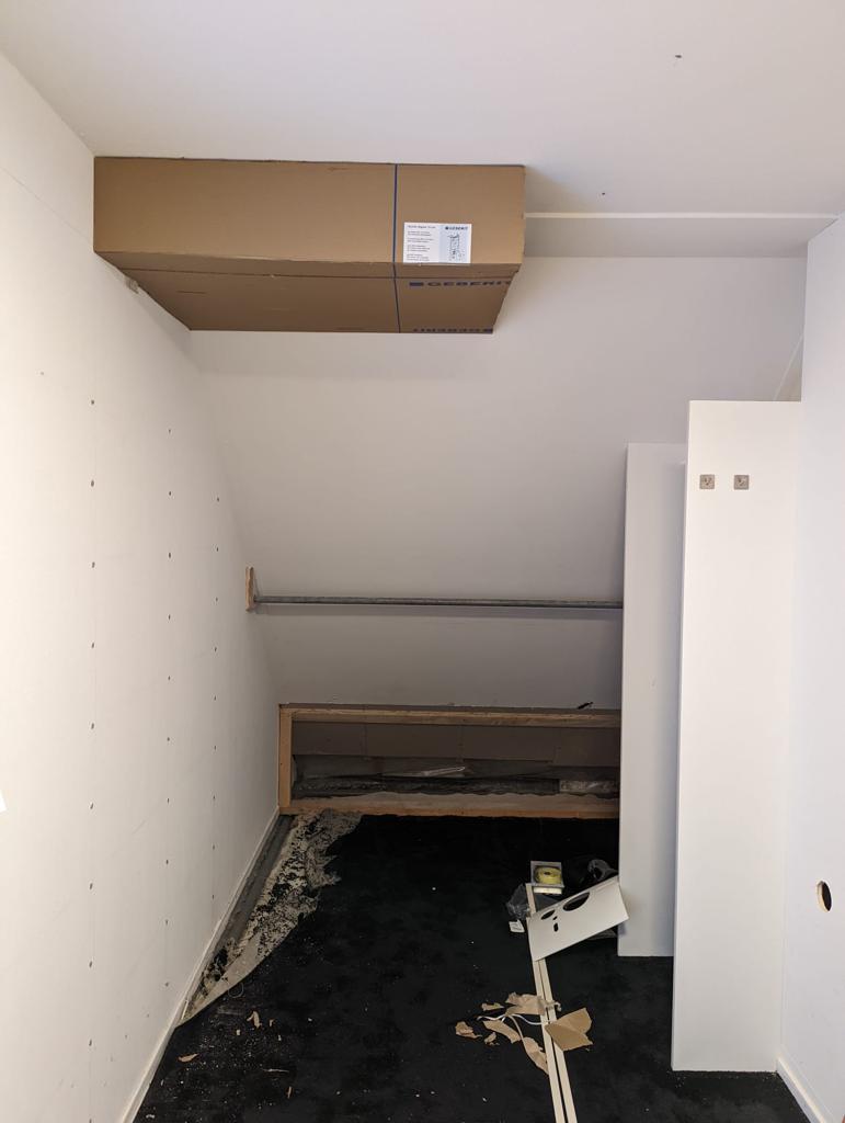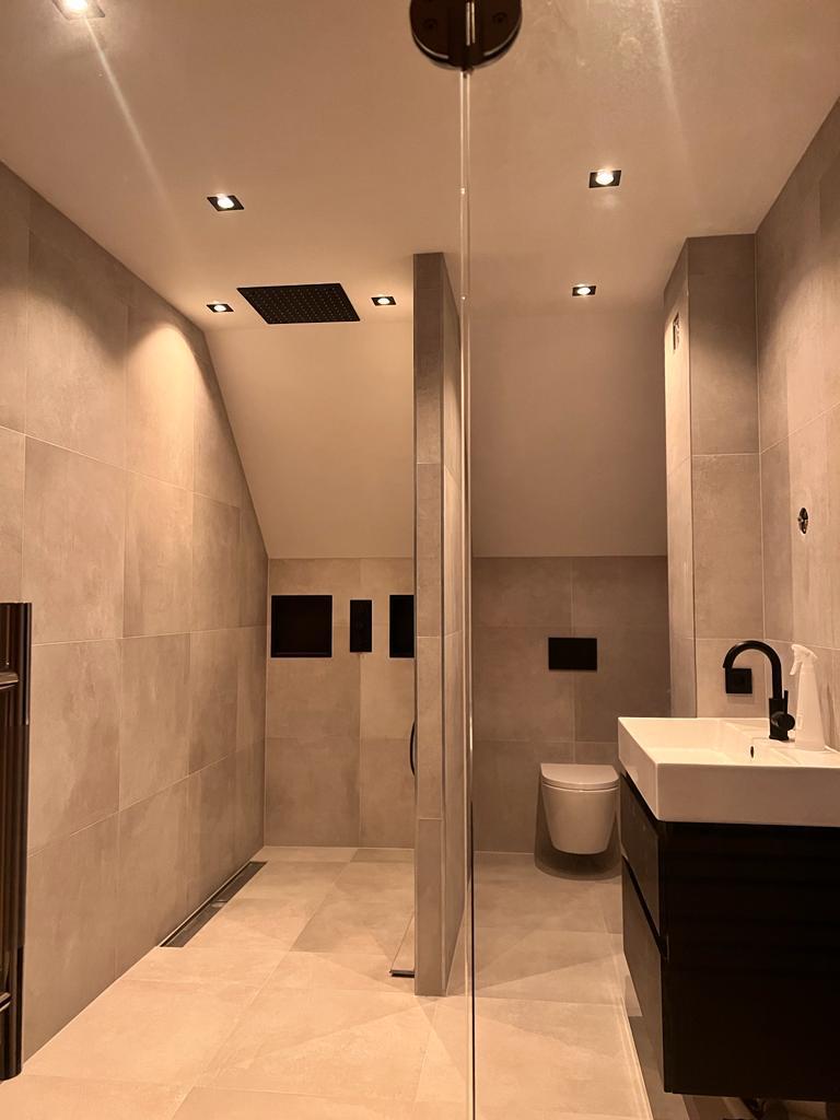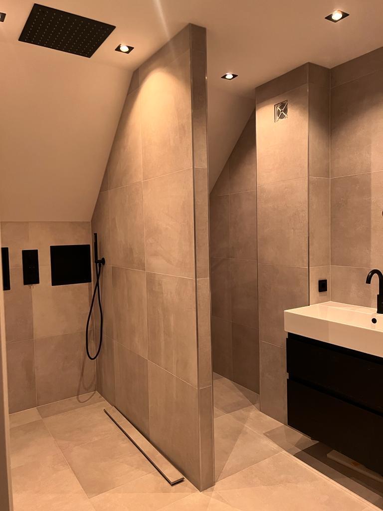 Op de eerste etage is er een tweede badkamer gerealiseerd, die kan worden beschouwd als een wellnessruimte in huis. De tegels zijn in facet gezaagd en de kitafwerking is strak, waardoor het eindresultaat eruitziet als een echte spa. De wens van de klant was een plafond regendouche. Belangrijk daarbij was dat er twee nissen in de muren moesten komen en er een muur moest geplaatst worden als afscheiding tussen douche en toilet. De klant had zelf een creatieve oplossing bedacht en had een kartonnen doos gevouwen en aan het plafond bevestigd om de mogelijkheden te verkennen. Deze foto is te vinden in het fotoalbum onderaan deze pagina.