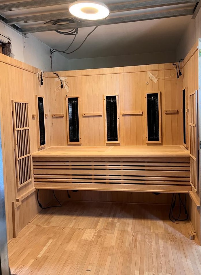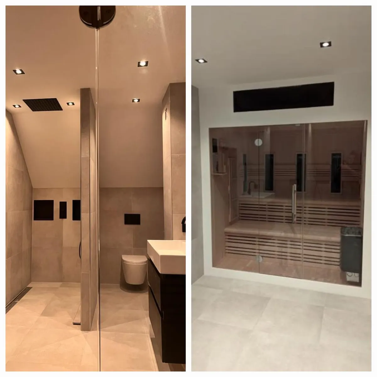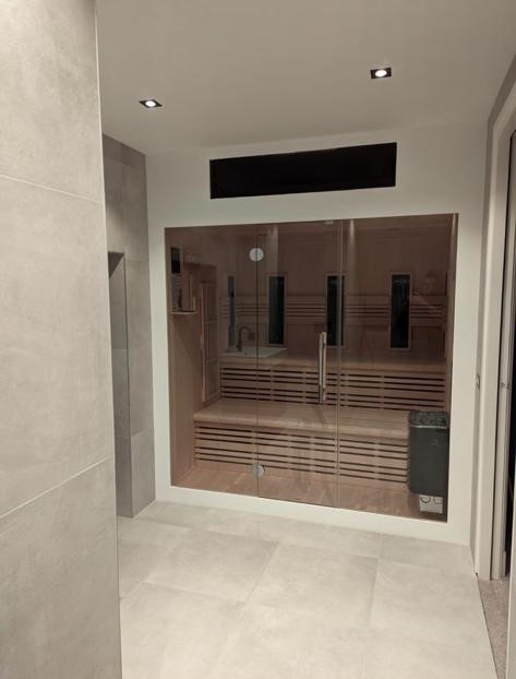 Als laatste wens was de sauna die in dezelfde badkamer moest worden geplaatst. De klant heeft zelf de sauna aangeschaft en wij hebben dit voor hen aangesloten en strak afgewerkt.