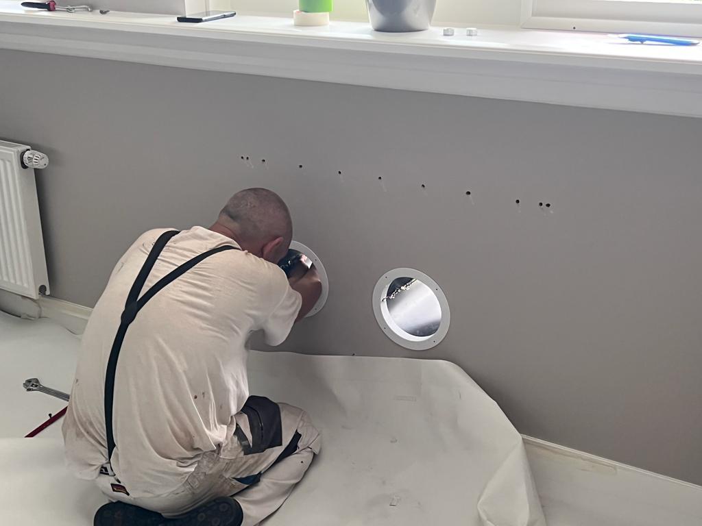 Om de vier ronde gaten in de muur netjes af te werken, zullen er op maat gemaakte ventilatieroosters worden geplaatst.
