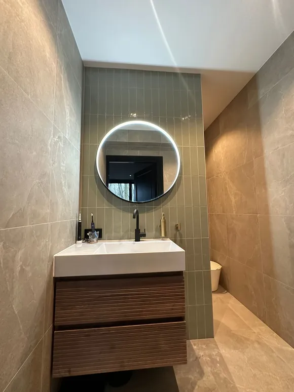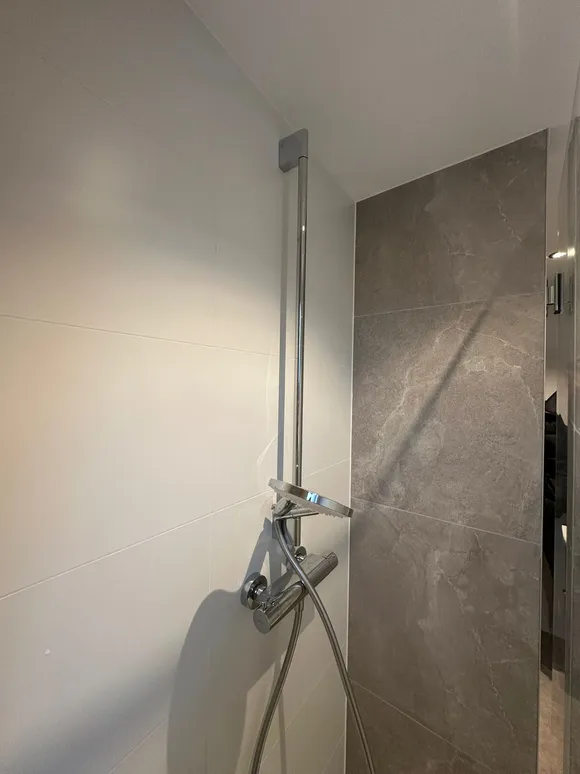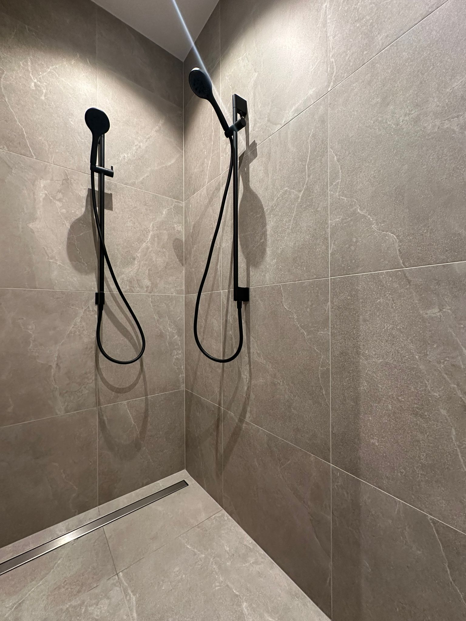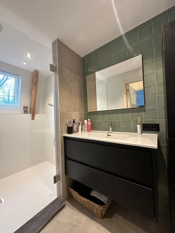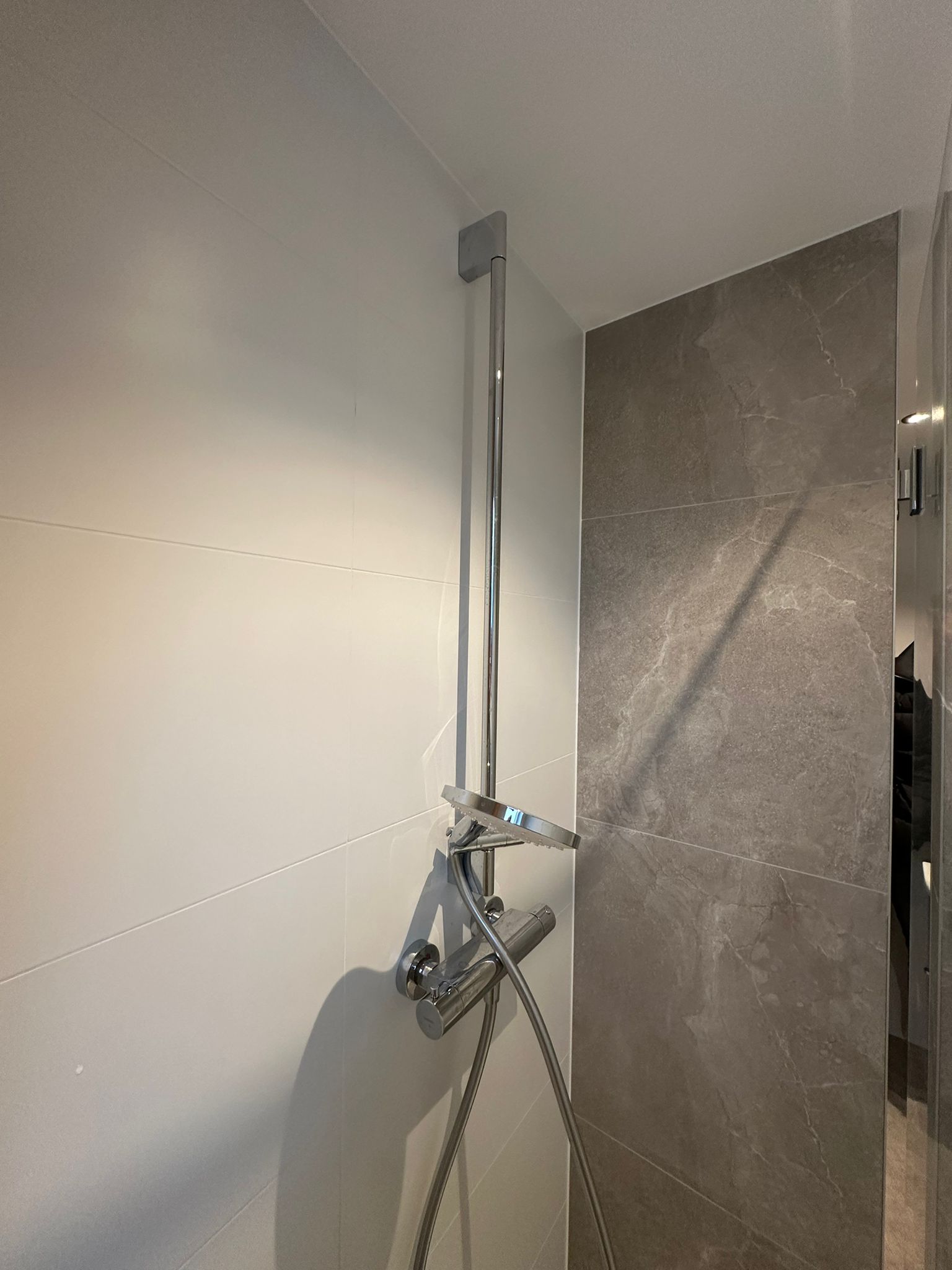 Voor de kinderen hebben we op de 1e verdieping een extra badkamer geïnstalleerd. Deze badkamer hebben we betegeld met vloerverwarming.