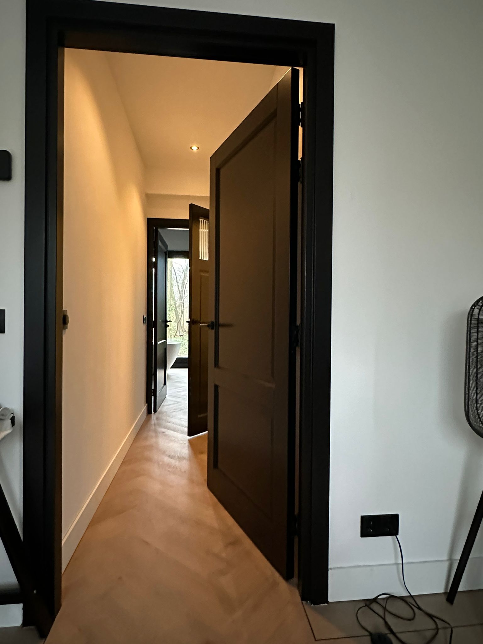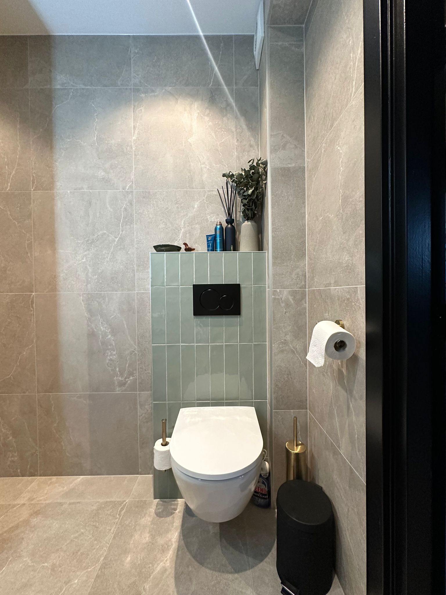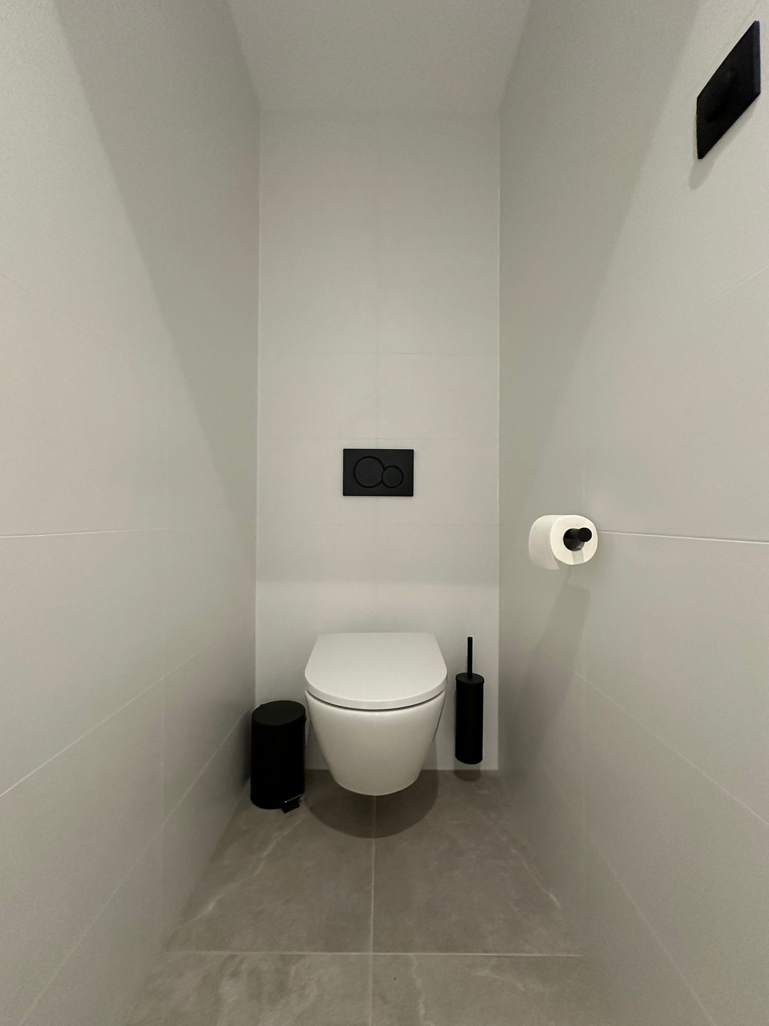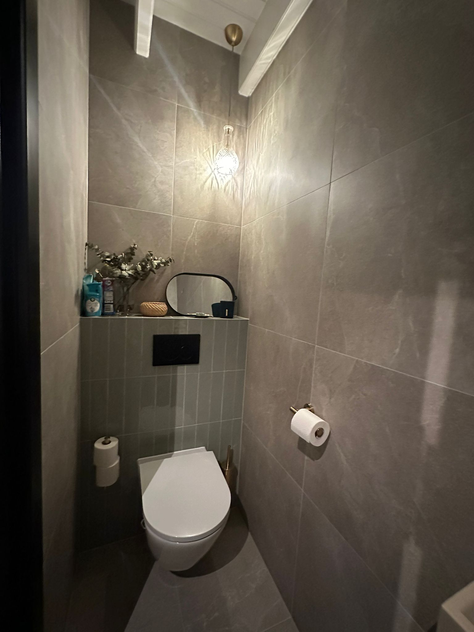 Naast bovengenoemde werkzaamheden, hebben we ook de toiletten geïnstalleerd en betegeld. Ook zijn de deuren en kozijnen zwart geschilderd om het huis een moderne look te geven.